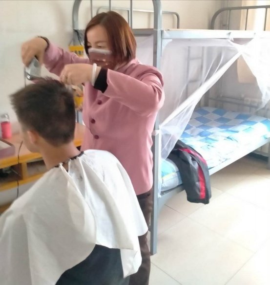 高三(50)班的班主任白海波老师,身穿大褂,戴着口罩,正认真地挥舞着手中的理发器为学生理发,她眼神专注,动作熟练,俨然一位专业的理发师。疫情期间,为保证学生的健康安全,学校实行封闭式管理,一些男生的头发过长,影响了仪容仪表。这可难不倒我们的“第二父母”老师们,不一会,一个班的男生都有了“整齐划一”的小平头,清爽干练。不仅仅是白老师,为学生理发已成为每位班主任老师,甚至是宿舍“楼妈”的必备技能。